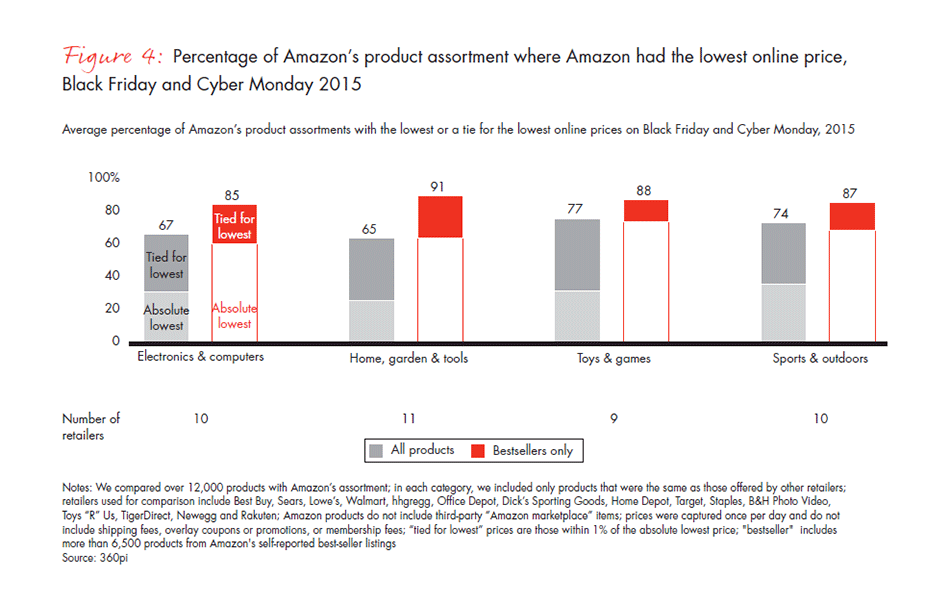 • Although it generally delivers on lower prices, Amazon does not always offer the lowest prices. Actual pricing data this holiday season confirm that Amazon is not the lowest-priced provider the majority of the time; instead, the company appears to be the fastest follower to the lowest-priced competitor, particularly on high-velocity products. Together with 360pi, we compared actual price points across several categories and retailers this holiday season (see Figure 4). In a sample of more than 12,000 online products, Amazon offered the lowest price about 30% of the time (excluding shipping fees and overlay coupons); it matched other retailers’ lowest price another 40% of the time. Amazon was much more aggressive on its best sellers, however, offering or matching the lowest price on about 90% of items this holiday season.