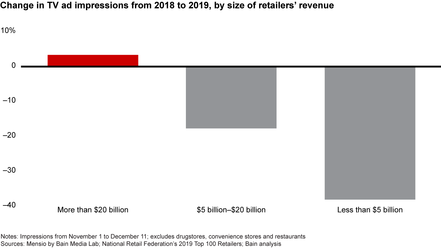 - While it trails digital, TV advertising remains a significant source of fourth-quarter spending. With Mensio by Bain Media Lab, we analyzed this season’s holiday ads and found that large retailers increased impressions over last year.