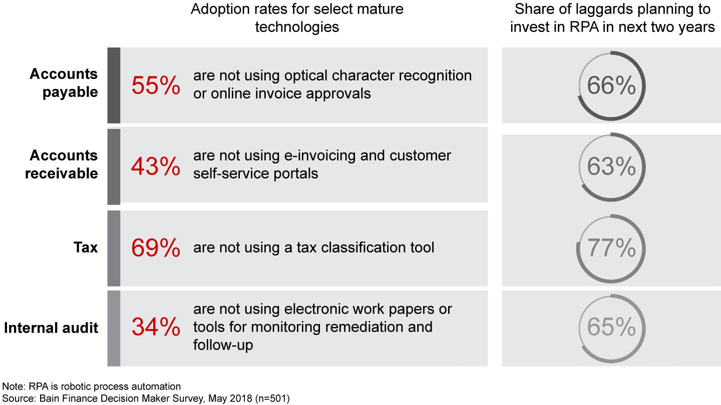 - In accounts receivable, 43% are not using basic technologies such as e-invoicing and customer self-service portals, yet 63% of these laggards plan to invest in RPA.
