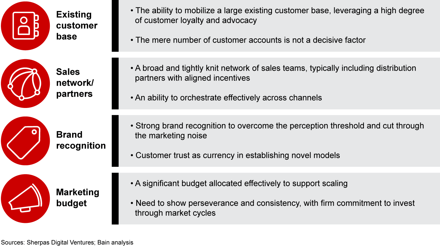 Realizing the full potential of wealth technologies (wealthtech) will mean fully capitalizing on the scale advantages of a digitally enabled business model (see Figure 2). Many large banks and insurance companies do possess assets that could allow them to scale up efficiently: a large customer base; a broad, tightly knit network of sales teams, including distribution partners; strong brand recognition; and an ample marketing budget (see Figure 3). But leveraging these assets will involve bold moves, especially to navigate the challenges associated with disrupting traditional distribution channels, such as captive sales organizations.