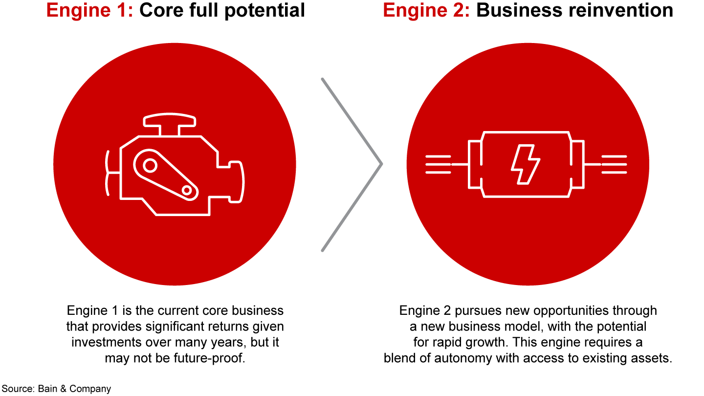 To that end, “Engine 1, Engine 2” is a useful approach. Engine 1, the core current proposition, concerns today's customers and capabilities. Engine 2 focuses on tomorrow's customers and tomorrow's capabilities in new markets with new competition and cost structures (see Figure 4).