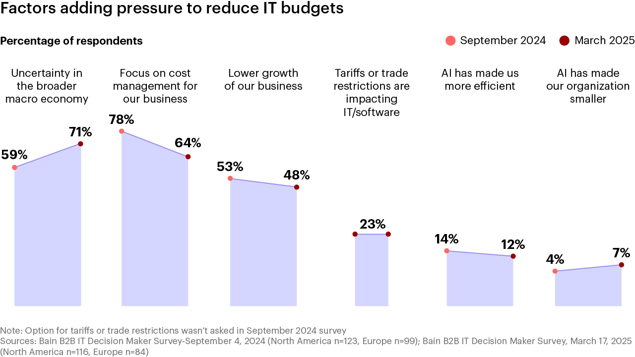 Economic uncertainty is the top source of IT budget pressure across North America and Europe. Bain’s recent survey of chief information officers and other senior B2B software buyers found that more than 60% are scrutinizing tech spending more closely than a year ago. Most haven’t changed their IT strategies, but many have dialed down growth expectations. More than 40% of respondents said that tariffs could have a minor effect on software spending, and more than 10% in the US predicted a major effect. AI is the exception. More than 80% of executives plan to increase AI investments in 2025, drawing from a mix of new and existing budgets—even as most are still shaping their overall AI strategy.
