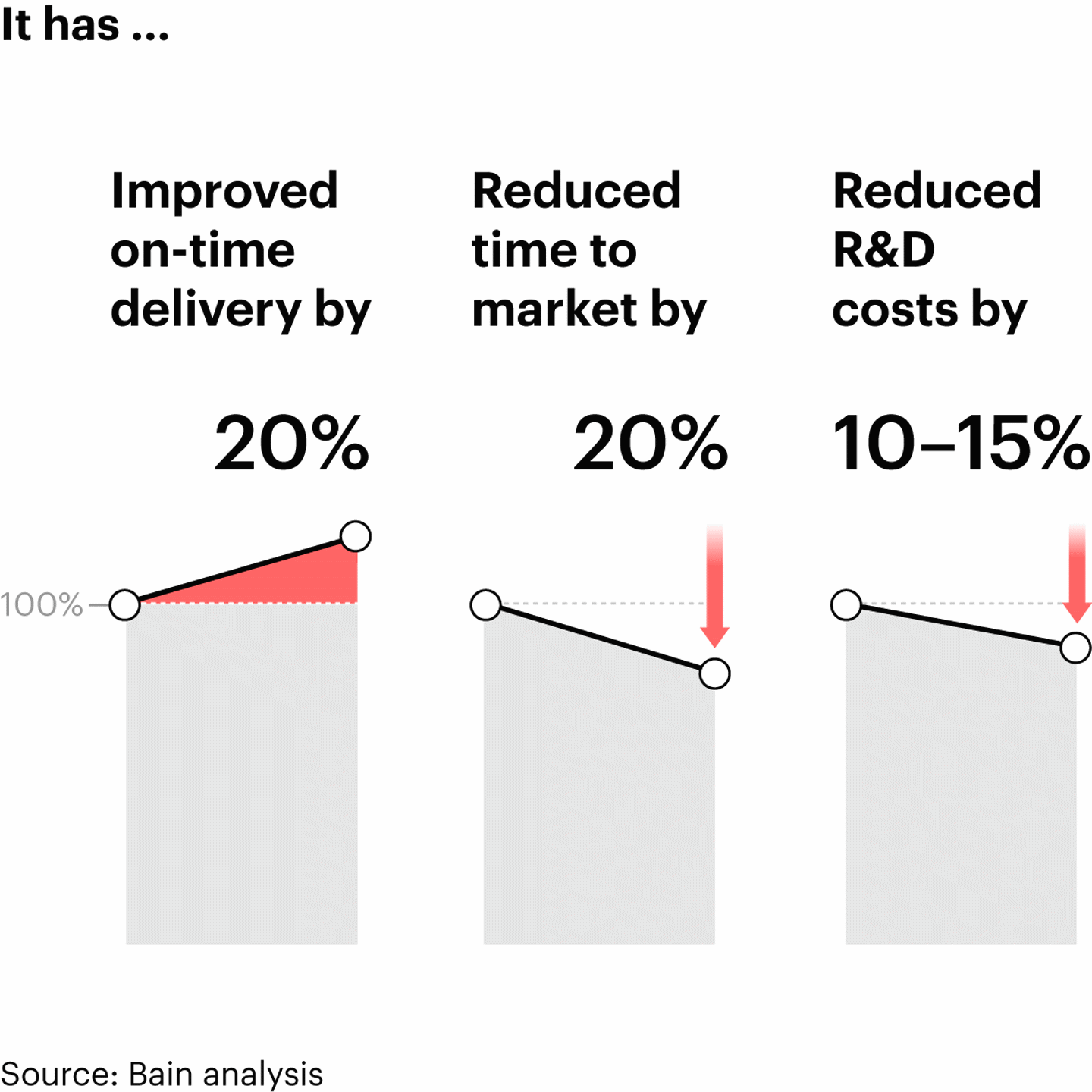 It’s not easy to implement, but the benefits of closed-loop PLM are significant. Leading companies using closed-loop PLM have improved their on-time delivery by more than 20% and reduced time to market by more than 20%, according to Bain research. They have also been able to reduce R&D costs by 10% to 15% (see Figure 1).