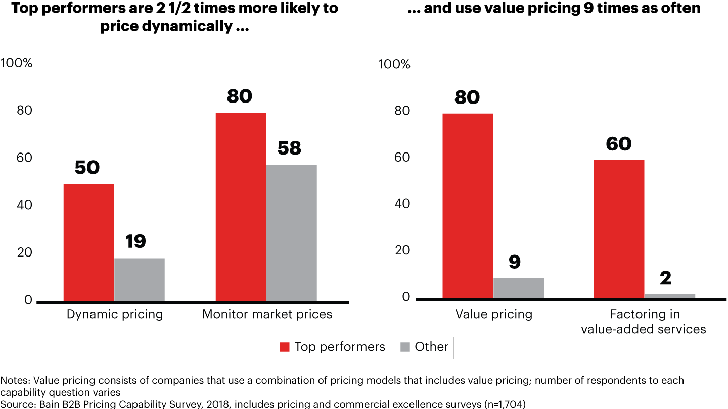 - Dynamic pricing. Leaders are more than twice as likely to use dynamic pricing, reacting quickly to changes in the market and taking full advantage of upswings and downturns. They forecast changes in input costs before they occur, monitor supply and demand dynamics, and have a sense for how customer demand is evolving. In addition, best-in-class companies know exactly which customers and products make money, which don't, and why. This helps them decide where to be more or less aggressive with pricing, in order to expand margins opportunistically. Importantly, the critical actions that turn this analysis into revenue are regular, cross-functional forums where teams review these insights and make nimble pricing decisions. One packaging distributor found that passing along cost increases quickly and giving back cost decreases slowly was worth an additional 50 to 100 basis points of EBITDA, compared with the closest competitor.