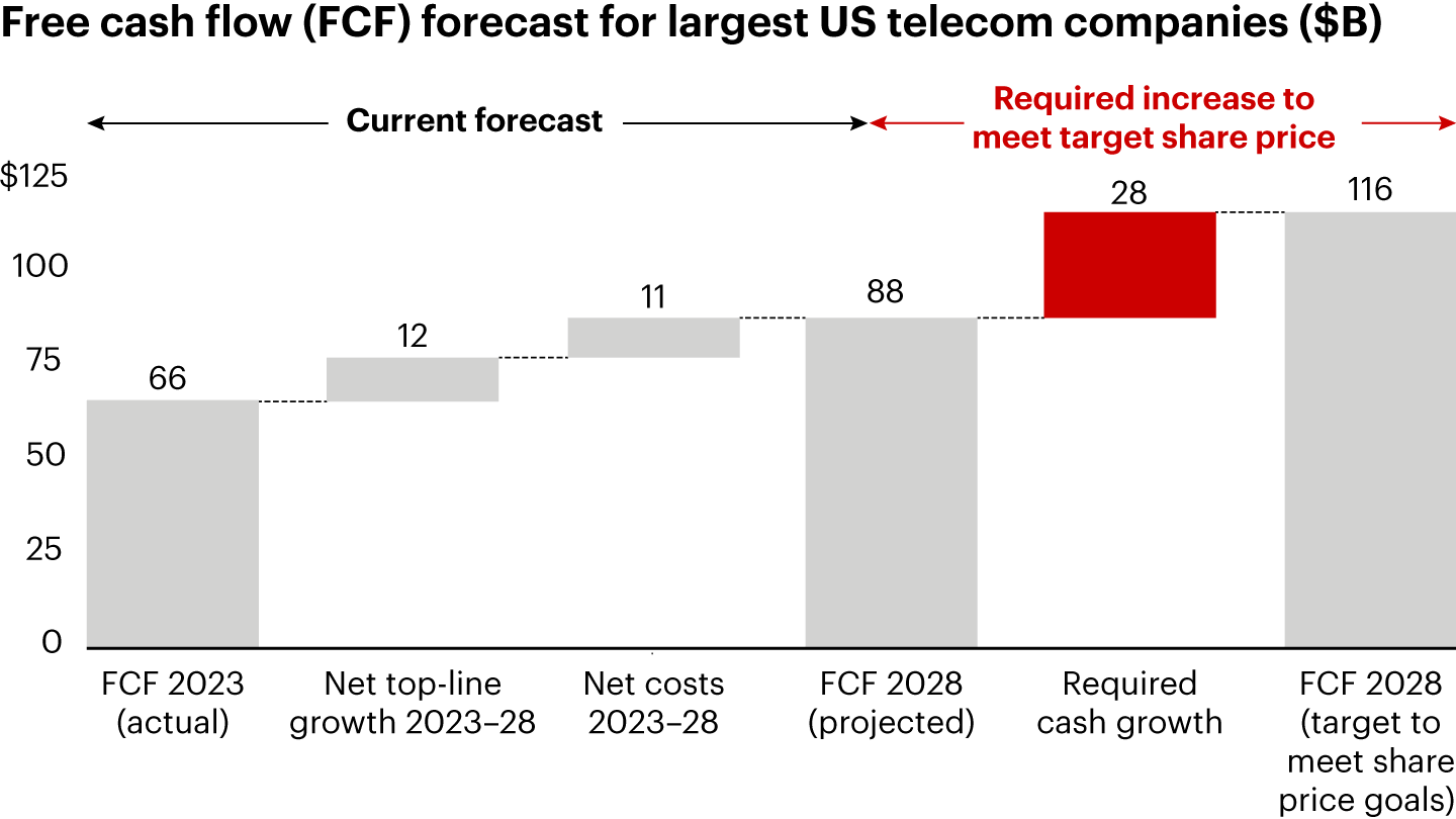 - Major US telecom operators face a $28 billion free cash flow gap to reach their aspirational share prices, Bain analysis found.