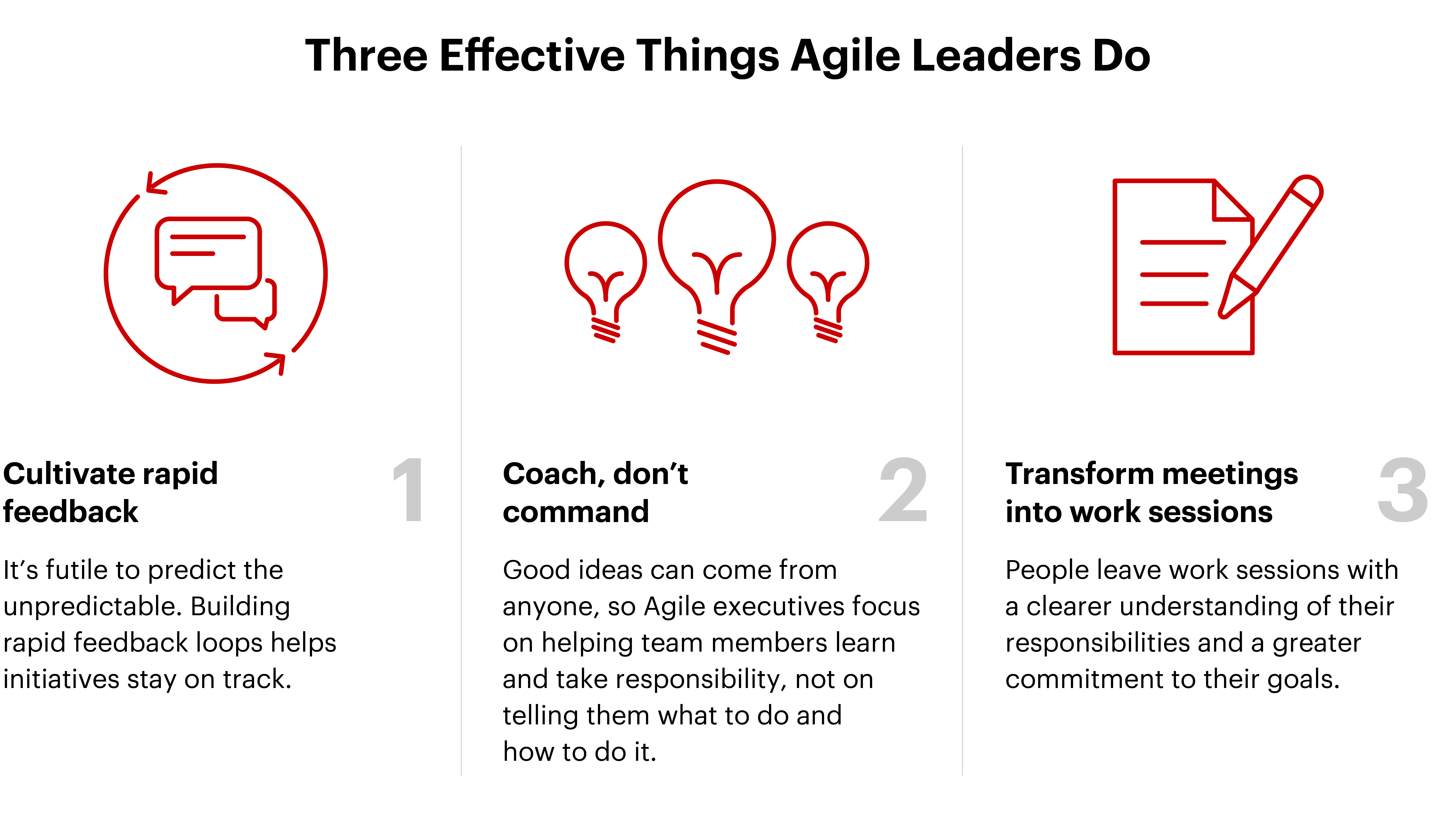 Humble leaders recognize the futility of predicting the unpredictable and instead build rapid feedback loops to ensure that initiatives stay on track. They understand that good ideas can come from anyone, not just from those with the highest status. So they view their job as helping team members learn and take responsibility, rather that telling them what to do and how to do it. This mindset also affects day-to-day operations. Because traditional meetings often take up a lot of time but produce unclear results, Agile executives restructure them as work sessions that arm participants with a clear understanding of their responsibilities and a greater commitment to their goals.