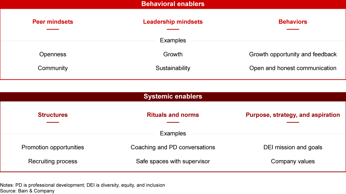 Yet while every employee’s sense and experience of inclusion benefits from both behavioral and systemic enablers, the mix of effective enablers—what we might call the texture of inclusion—varies across groups. Thus, for example, while both systemic and behavioral enablers drive inclusion for women and men, behavioral enablers have a larger impact on inclusion for women than for men. (Specific behavioral enablers that increase inclusion for women—at least more than for men—include open and honest communications, growth opportunities with transparent feedback, and empathy.)