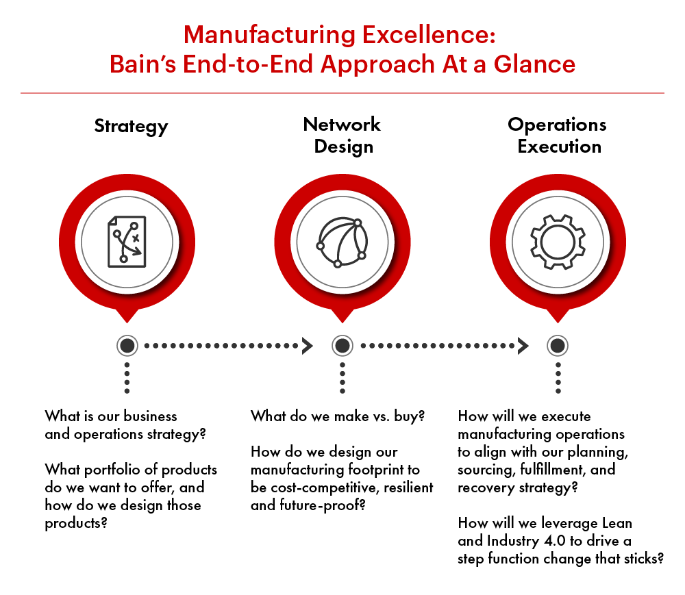 Gli strumenti di diagnosi ed analisi di Bain, comprendono confronti con le migliori pratiche, valutazioni del potenziale di iniziative di lean manufacturing, identificazione di modifiche che possano generare i migliori benefici, nonché definizione dei migliori metodi per conseguirli. Aiutiamo, nella pratica e non nella teorica, i clienti ad attuare i miglioramenti individuati.