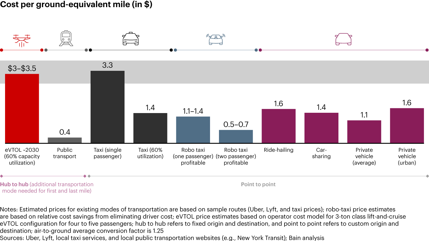 Economic viability. Bringing down the total cost of ownership is another challenge. Ultimately, travelers will calculate the trade-off between time savings and cost per passenger per mile, determining the pace of adoption and market size. In most cases, ground transportation will continue to be cheaper, especially as autonomous taxis become a viable alternative (see Figure 2). While scaling their business, operators likely will need to fund initial losses (as Uber and Lyft did).