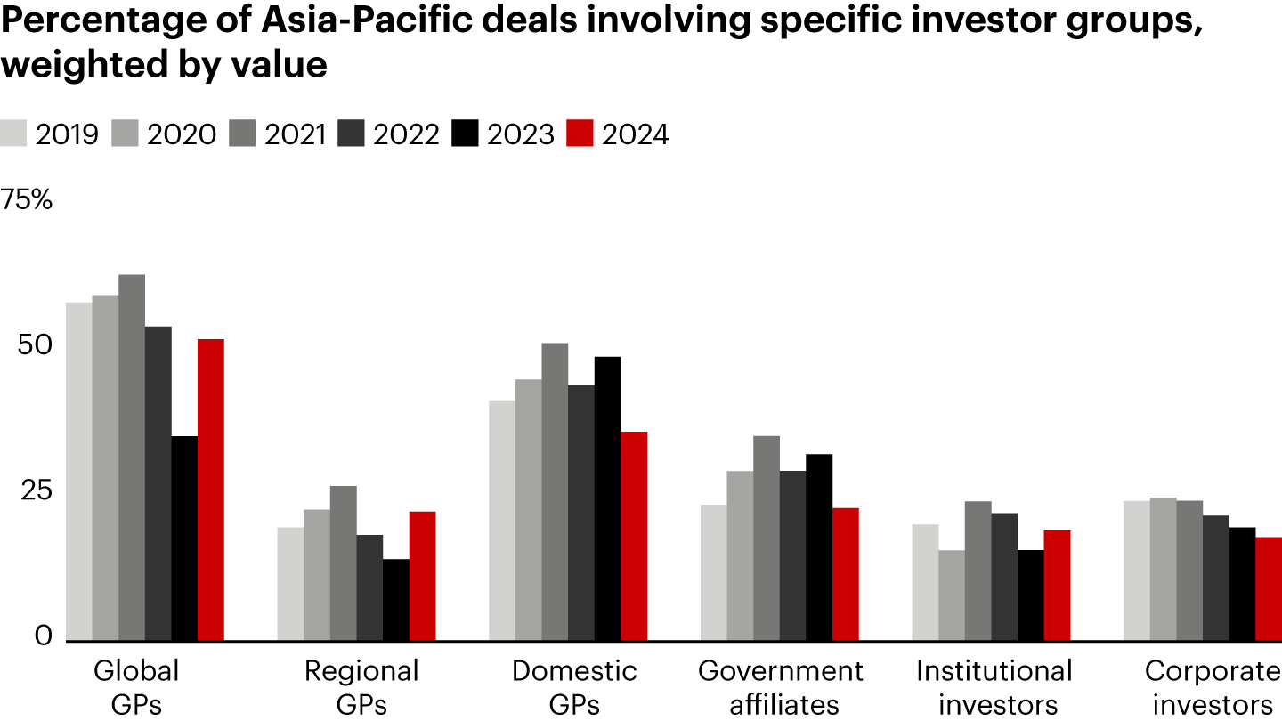 Sources: AVCJ; Bain analysisBy contrast, the top 20 investors’ share of total deal value remained high at 41%. Global fund managers and regional fund managers increased their share of deal value significantly in 2024 (see Figure 8), and Asia-Pacific investors view these two groups as their biggest competitive threat.