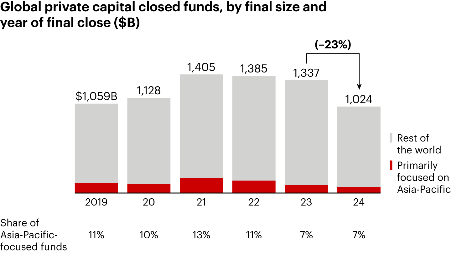 Global fund-raising in 2024 was down 23%, excluding RMB funds, and Asia-Pacific’s share of global fund-raising was a low 7%, down from 13% in 2021 (see Figure 14).