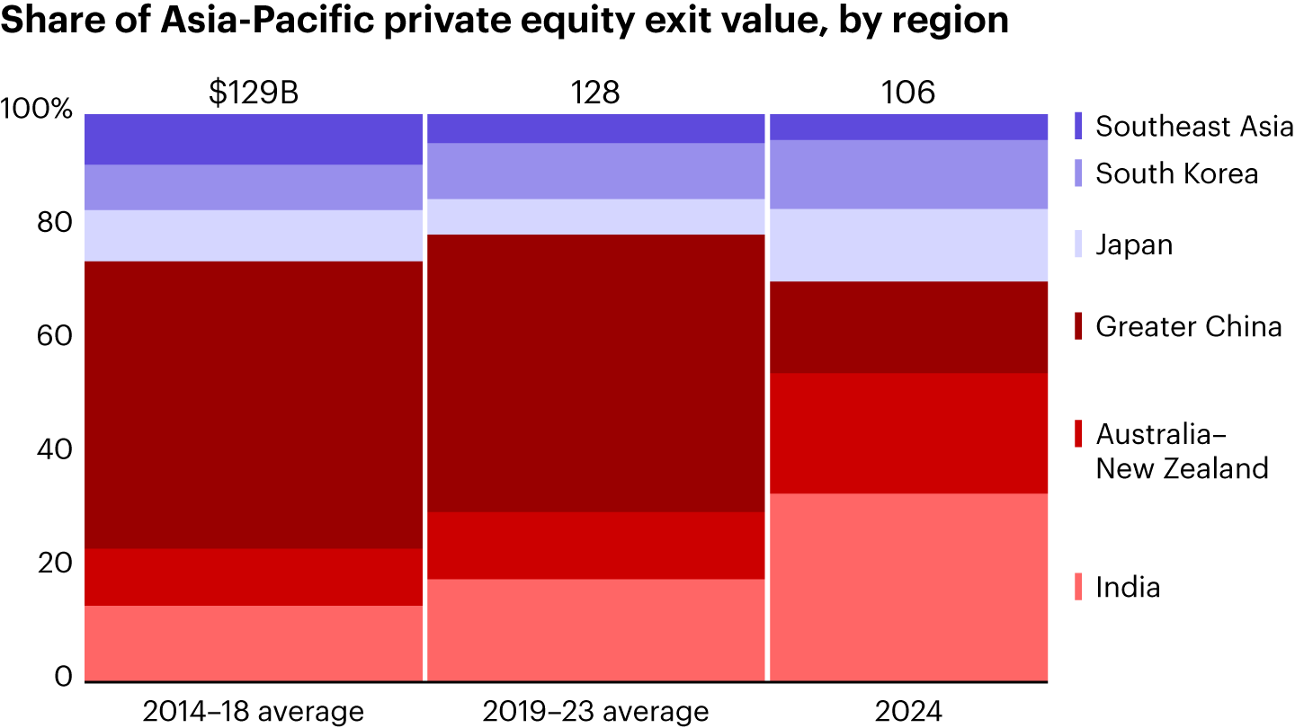 The number and value of exits in the Asia-Pacific market were flat, but a sharp drop in Greater China’s exit value masked gains in other countries. Most fund managers across the region said the exit environment improved in 2024. Secondary sales became the largest exit type, as well as an attractive channel for GPs to accelerate distributions and for LPs to improve liquidity. India became the region’s biggest exit market, powered by a large number of initial public offering (IPO) exits. The value of Asia-Pacific IPO exits fell to only 31% of total exit value in 2024, compared with the previous five-year average of 48%. The main reason for that decline was the sluggish public market performance in China and other markets.