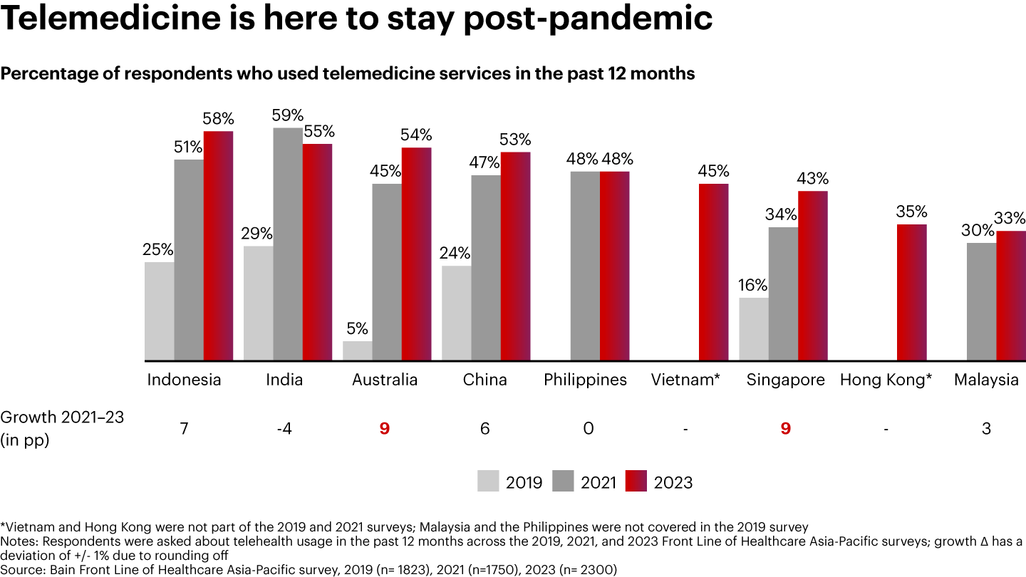 While telemedicine had begun penetrating many Asian countries pre-Covid-19, its adoption nearly doubled during the pandemic (2019‒2021) across all Asian-Pacific countries except Australia, where the adoption increased ninefold. A recent Bain Survey of 2,300 consumers in the Asia-Pacific region found that while the rate of telehealth uptake has slowed since the end of the pandemic, telemedicine has maintained high penetration levels even after patients return to physical interactions with doctors.