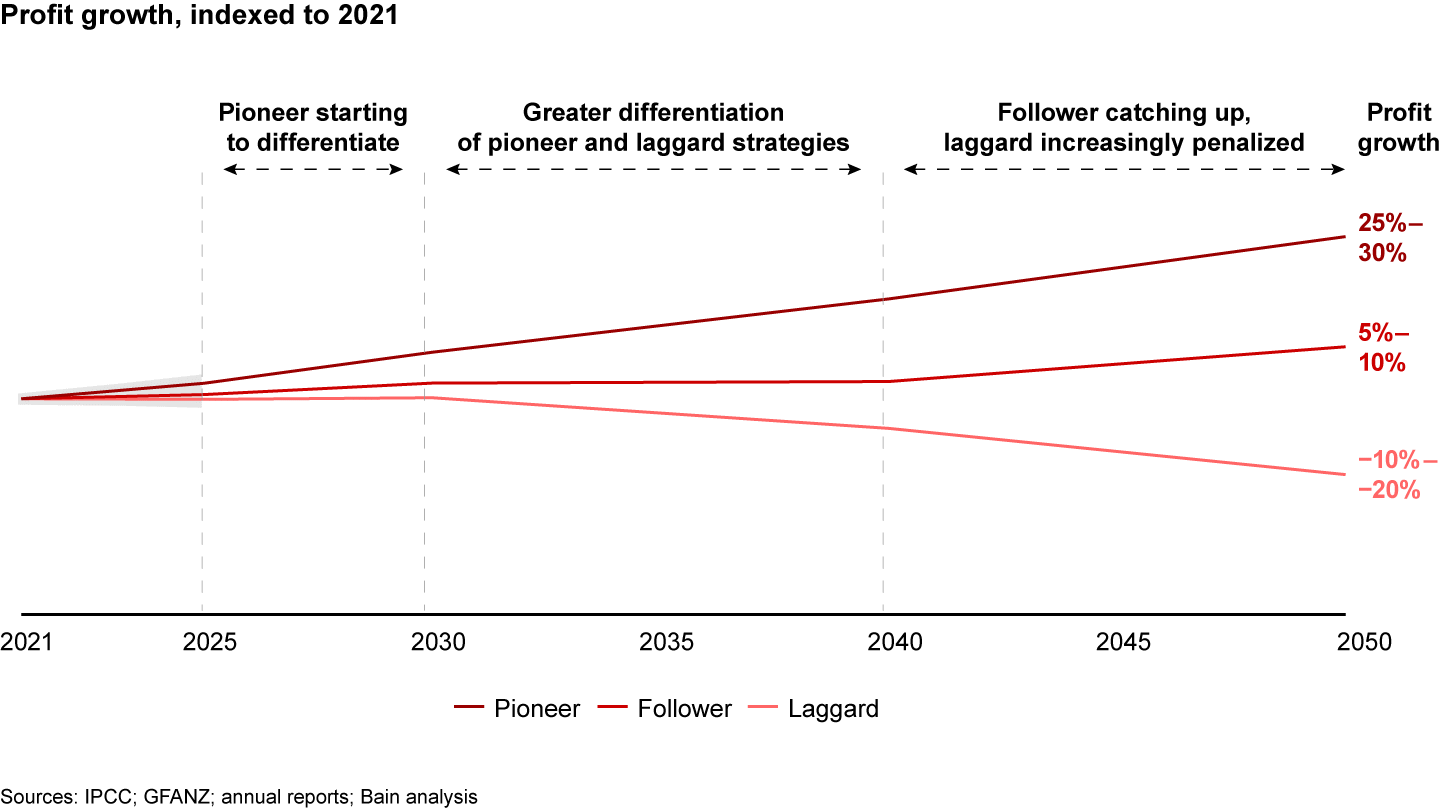 Each approach has a different outcome on profits, with the pioneer bank outperforming because of a more rapid and robust transition. All else equal, a pioneer will grow profits by 25%–30% by 2050, compared to 5%–10% for a follower, and a profit erosion of -10% to -20% for a laggard (see Figure 4).