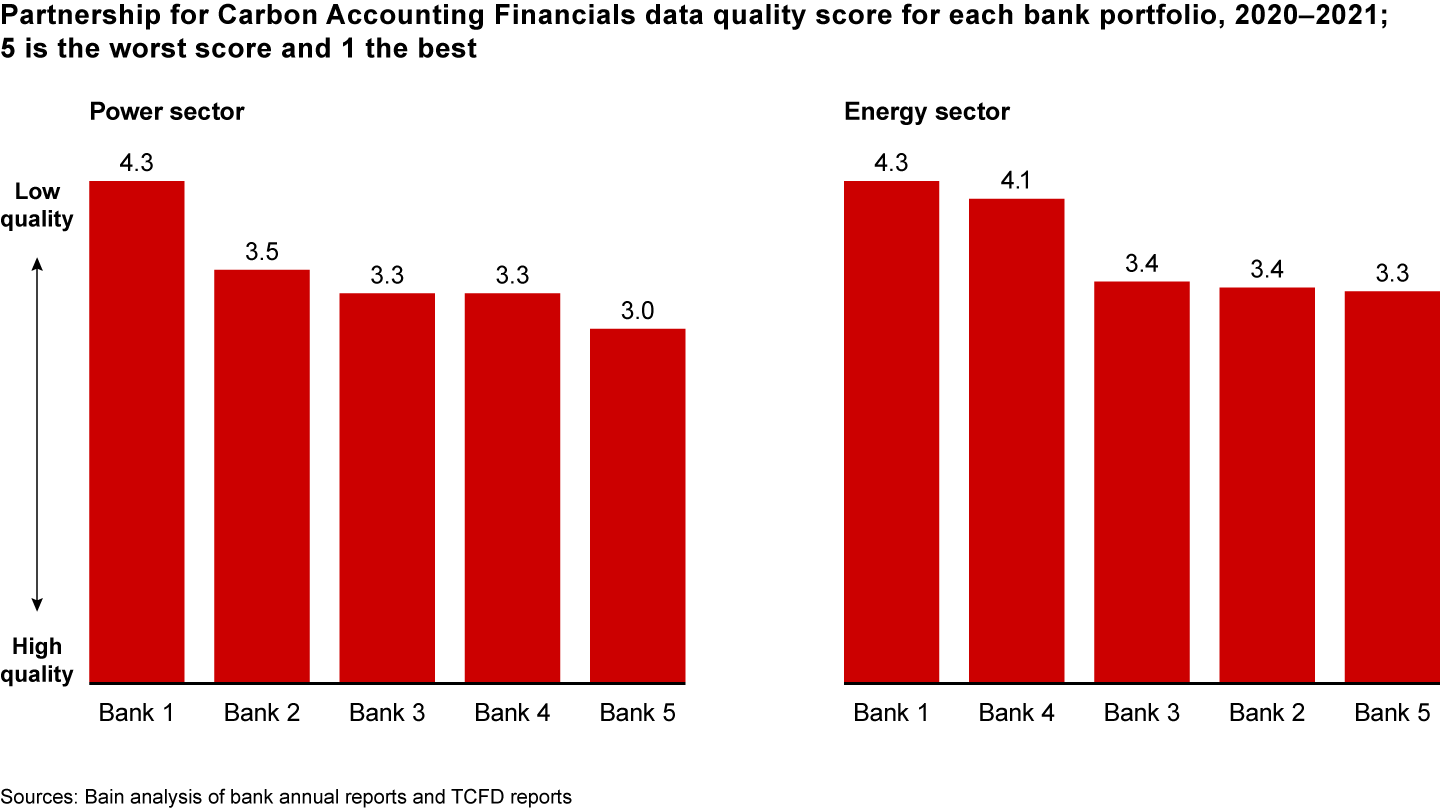 Most banks currently rely on emissions data with little granularity for large shares of their portfolios, which allows them to make only intermediate or high-level measurements. Few banks have a view into the carbon footprint of funded clients and projects at the most specific level—the activity, location, energy sources, or other characteristics that may correlate with emissions. Based on data disclosed by five major banks in each of two industries, the average score ranges between 3 and 4.3, with 5 being the poorest quality score (see Figure 3).
