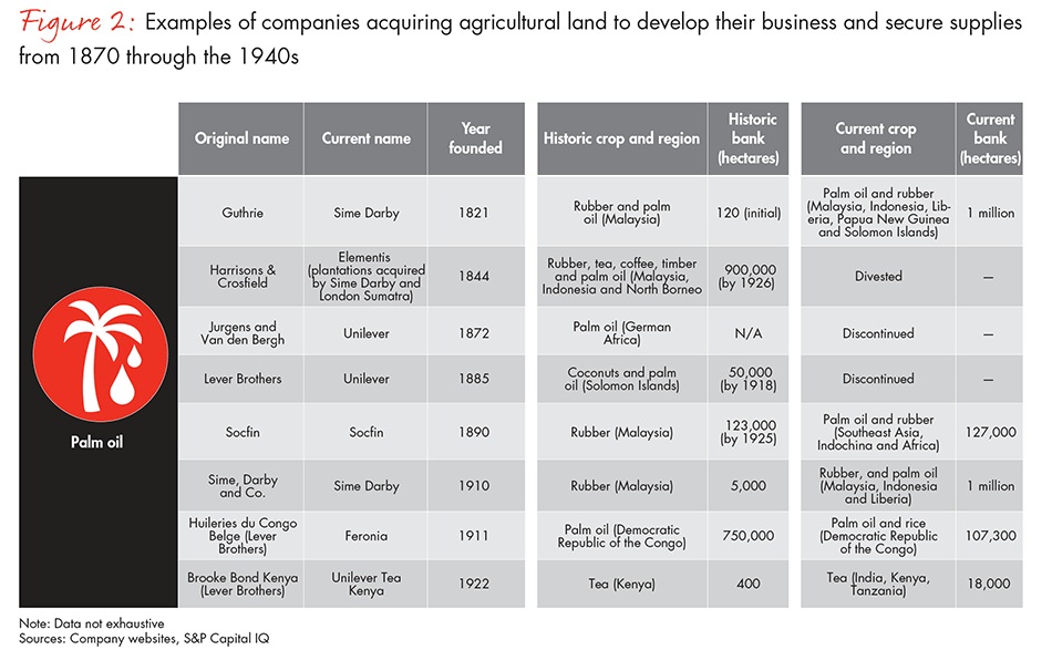 Mostly from around 1870 to 1929 (although some as late as 1940), companies, tycoons and wealthy families were granted, bought or leased vast tracts of land around the (mostly tropical) world, and implemented agricultural-industrial projects in rubber, cocoa, bananas, palm oil, coffee, sugarcane and timber. Some of these companies or their successors still exist today. Others slowly morphed into consumer products or trading companies, shedding their land holdings along the way (see Figure 2).