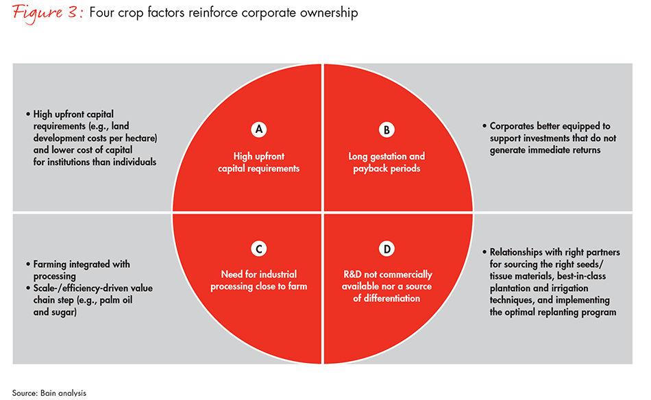 In many of these crops, a first-step conversion process is required, and it needs to happen near agricultural production either due to crop perishability or to minimize the transportation costs for low-valued commodities (or both). Consider sugarcane and the fruits of the oil palm. If not quickly milled, both will perish, and only a small fraction of the harvest will turn into a salable product. Coffee beans must be dried and roasted. Latex must be coagulated and dried. With some of these processes, high industrial asset utilization is critical for profitability. Owners of these assets prefer to also own or lease land to control a share of the agricultural production and ensure a stable supply.