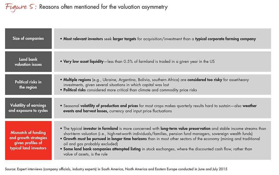 Understanding the reasons behind this systematic discount not only solves these companies’ valuation issues but also sheds light on the possible path to liquidity for many privately held farming companies. With those goals in mind, we interviewed sector executives and equity analysts as well as active and passive investors in agricultural land for their insights (see Figure 5).