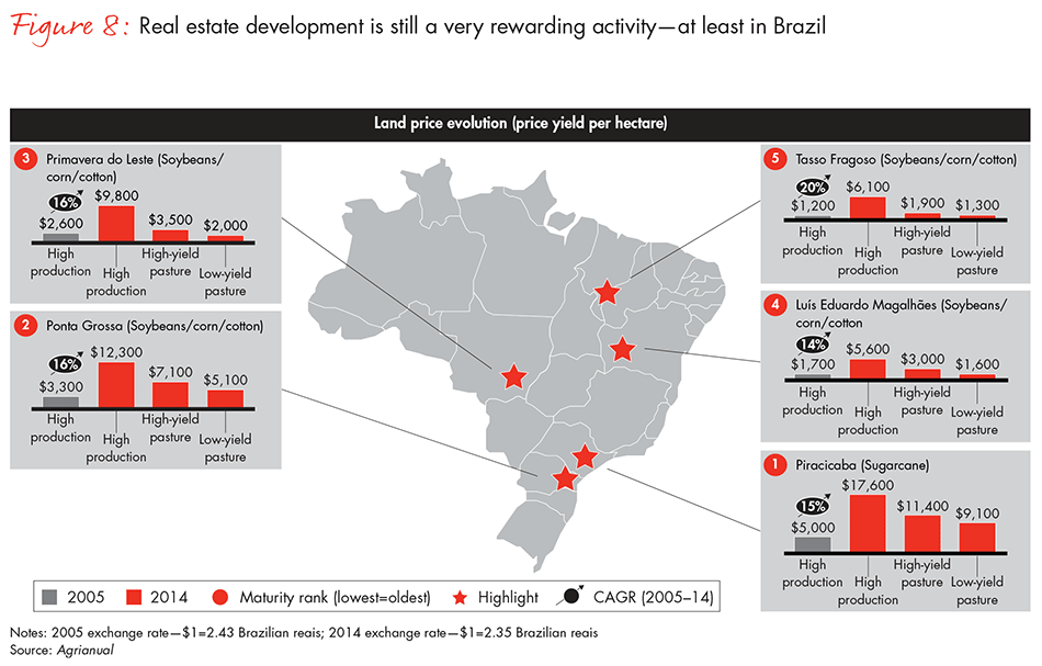 From 2005 to 2014,6 land conversion in South America was a rewarding activity. We calculated the hypothetical cash-on-cash return of land conversion in various Brazilian regions in a range of 3 to 5.5 times the invested capital, in nominal local currency. Some of the farming companies surveyed describe themselves as real estate developers, and they can create significant shareholder value. However, this approach may present challenges. Interviewed executives believe the number of good land conversion opportunities is finite (and not very large to begin with). Agricultural expansion also depends on rising commodity prices that would justify the continual addition of cost-marginal land into the global supply. The long-term prospects for agriculture remain bullish, given the rising global population and increasing incomes, but the growth pace going forward will be slower and probably more volatile than in recent history. This will bring additional challenges to investors in land conversion.