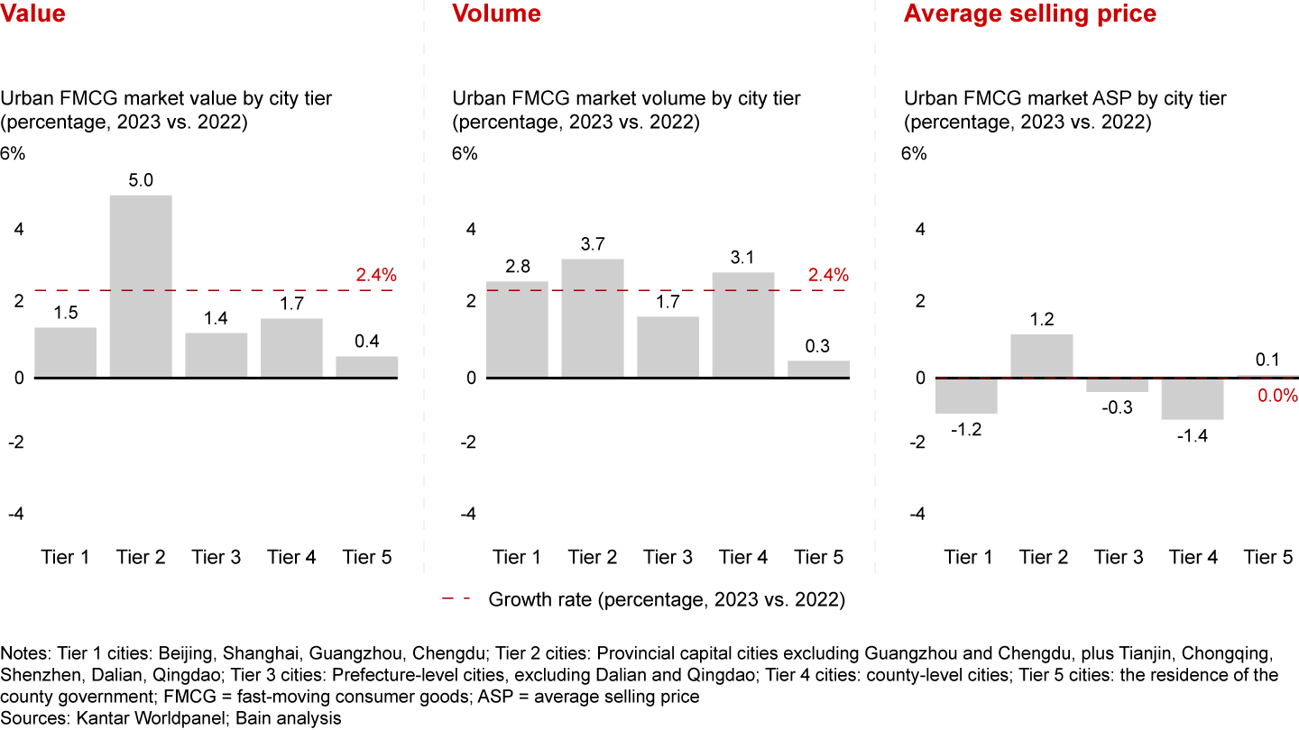 Geographically, growth was led by Tier 2 cities across all city tiers, in terms of volume and ASPs.4 These cities have become destinations for population migration and test fields for FMCG brands. Tier 2 cities have received a population influx of 8 million or more in the past four years. For example, Changsha has seen a population increase of 1.2 million (+13%), outgrowing other cities in Hunan. These cities have become the launchpads for the transformation pilots and initiatives of multinational corporations and the birthplace of insurgent FMCG brands.