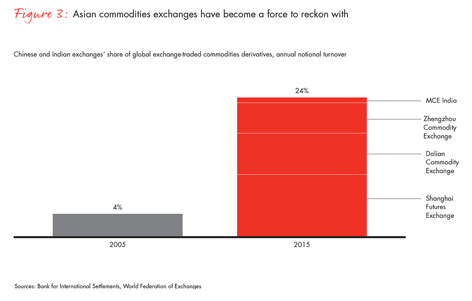 Asia represents the region with the largest growth potential in traded markets, and the structures of Asian markets will likely feature significant innovation. China and India, for instance, have gained ground in exchange-traded commodities futures (see Figure 3). These markets will gain scale in a technological and regulatory context that is quite different from what the US or Europe experienced several decades ago. They may leapfrog practices in the West, just as China already has in peer-to-peer consumer payments; this has also occurred in Brazil and Korea. The latter two countries developed primarily exchange-traded market structures in FX and rates derivatives, compared with the older and primarily OTC market structure in the US and Europe.