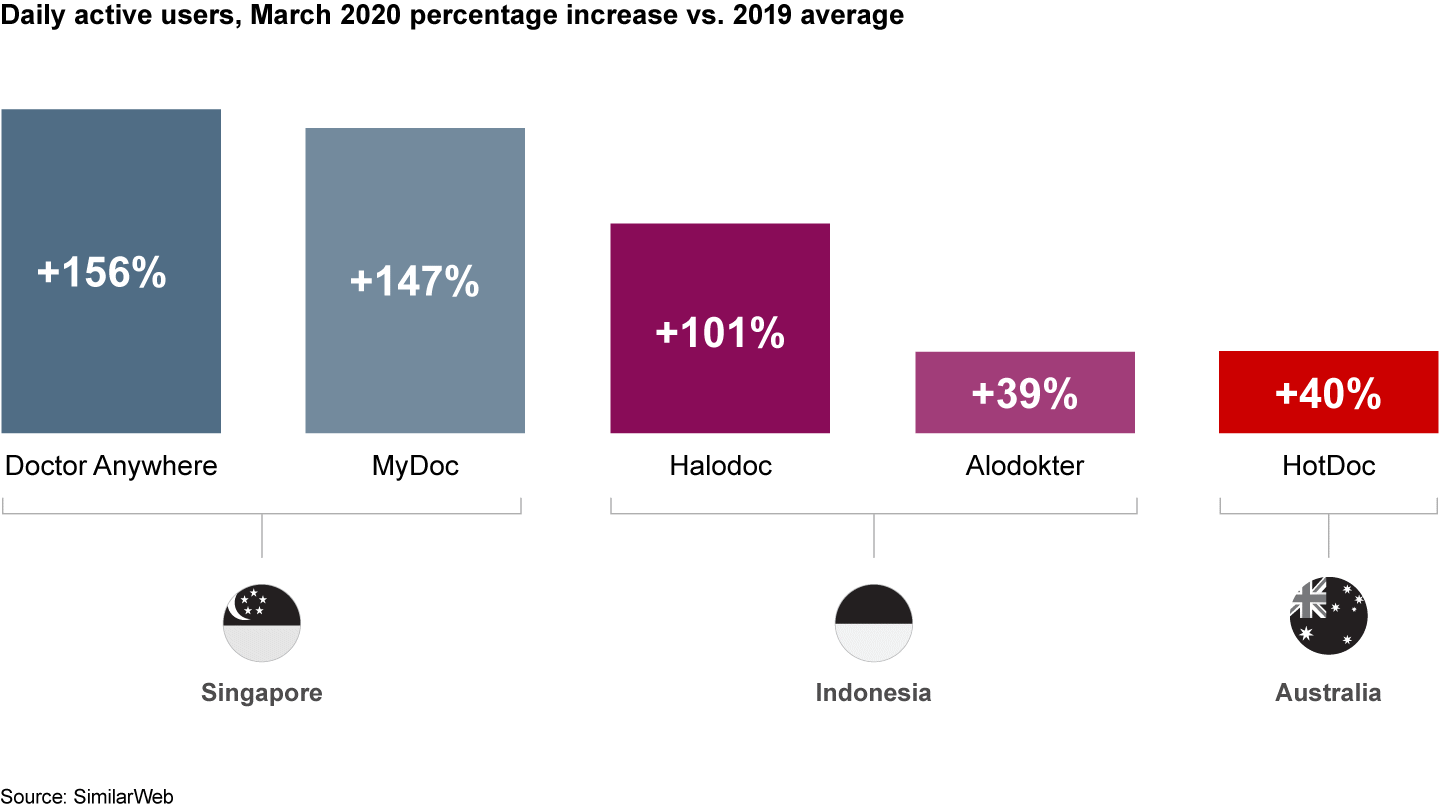 Digital health platforms in Singapore, Indonesia and Australia are reporting a surge of activity, too. At MyDoc, a telemedicine platform headquartered in Singapore, the number of daily active users rose 60% in February and more than doubled again in March (see Figures 3 & 4). As part of its response to the pandemic, the company set up a virtual Covid-19 clinic where doctors trained in detecting the virus evaluate patients’ symptoms and refer suspicious cases to the country’s Ministry of Health for testing and isolation.