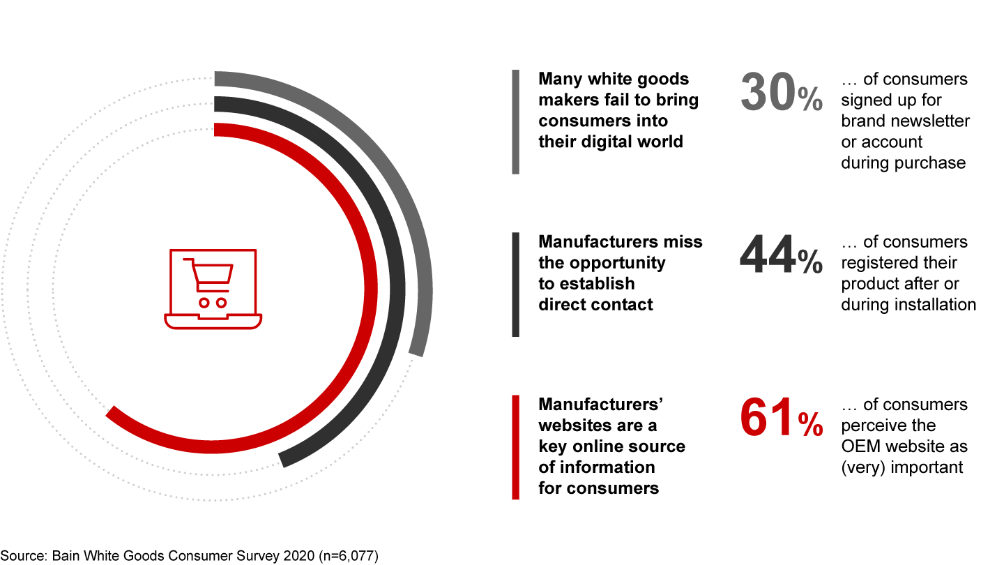 Manufacturers that lag in building direct-to-consumer relationships early in the purchase process will be less effective at direct marketing and sales of add-on services, consumables and upgrades. Covid-19 has shown how vital a digital link can be for appliance makers and their customers. In the midst of the pandemic lockdown, one major white goods company had difficulty communicating to its customers that its service team was available to repair failed appliances in homes. The problem: Few customers had opted in to direct communications with the company. Future winners will excel at connecting with customers before, during and after a sale. Strong customer ties, in turn, will allow them to build a rich database of insights about consumer purchasing behavior.