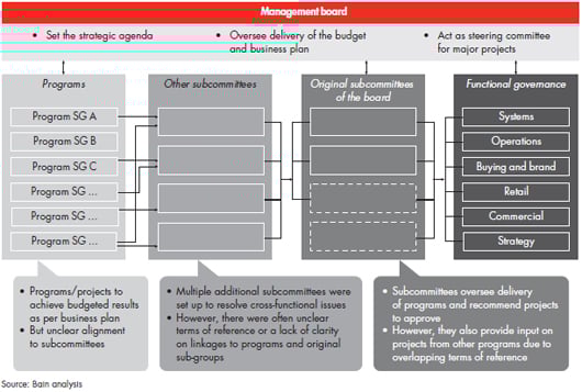 To solve the problem, the retailer reorganized its governance system. One step was to subsume many of the committees into a single program board with well-defined responsibilities, such as overseeing execution against the business plan and budget. Another was to clarify the roles of each surviving committee. In the past, for example, the capital expenditures committee might have begun discussing the content of a menswear-redesign project; now its job was explicitly limited to approving or disapproving the proposed investment. The governance reorganization enabled the retailer to eliminate nearly 70 percent of committees, with an equally big drop in the number of meetings. The company estimated that the reduction would free up roughly 50 percent of the typical executive’s time.
