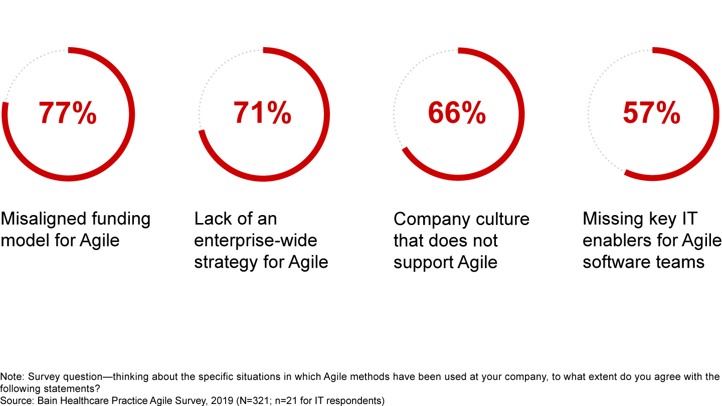 By far, the biggest impediment to using Agile successfully is a failure to adhere to the basic principles and methods. We call that approach “bad Agile.” If you hear a colleague saying, “We want to be agile, but we’re not going to adopt Agile innovation (or Scrum or other Agile methodologies),” that’s a signal that things are likely to go wrong. The reason is clear: When companies use the language of Agile innovation without changing how they work, their underlying agility tends to stay the same. When we asked our 321 senior healthcare executives about recent innovation failures in their companies, the three most cited reasons were ineffective cross-functional collaboration, failure to collaborate effectively with customers and failure to dedicate sufficient resources to scale projects. Agile solves each of these problems.