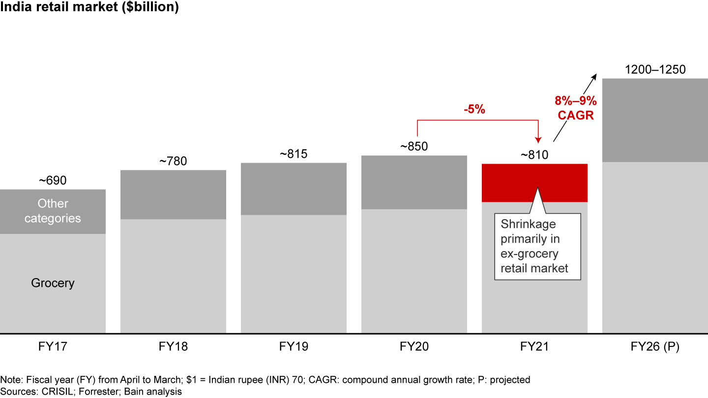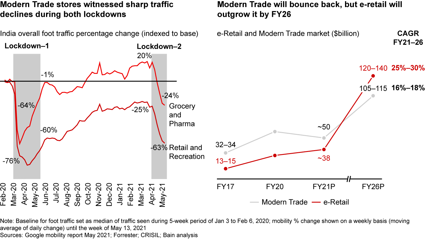 • The fiscal year ending March 2021 showed contrasts in India’s retail market: the overall retail market shrunk by 5%, along with a 7.3% contraction in GDP due to sustained lockdowns across India. However, the e-retail market surged by 5% to reach $38 billion despite a multimonth lockdown. This was driven by Covid-19, which caused increased adoption of online channels.