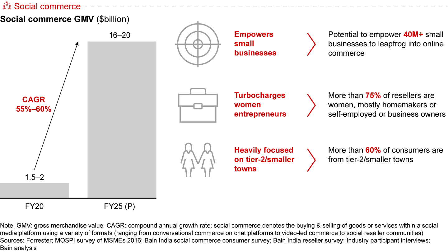 • Social commerce: Millions of smaller retailers are finding innovative ways to sell directly to consumers through many social formats. Social-led models are empowering Bharat’s sellers and women entrepreneurs, and three of every five shoppers now come from tier 2/smaller towns. Social commerce is expected to increase from $1.5–2 billion in FY20 to $16–20 billion in FY25, growing at 55%–60% CAGR.