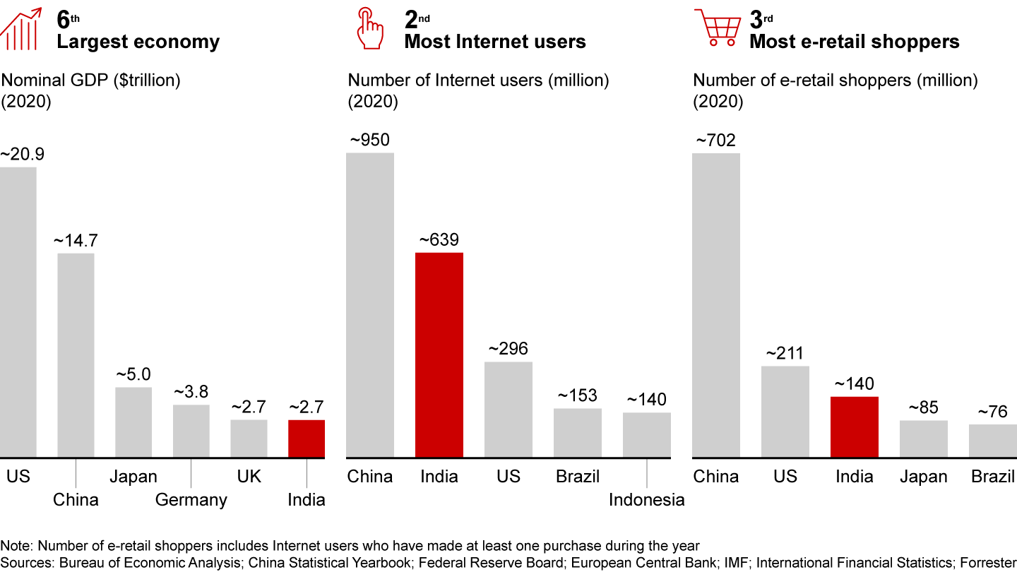 • India has the third-largest online shopper base globally, with 140 million e-retail shoppers in 2020, only behind China and the US.