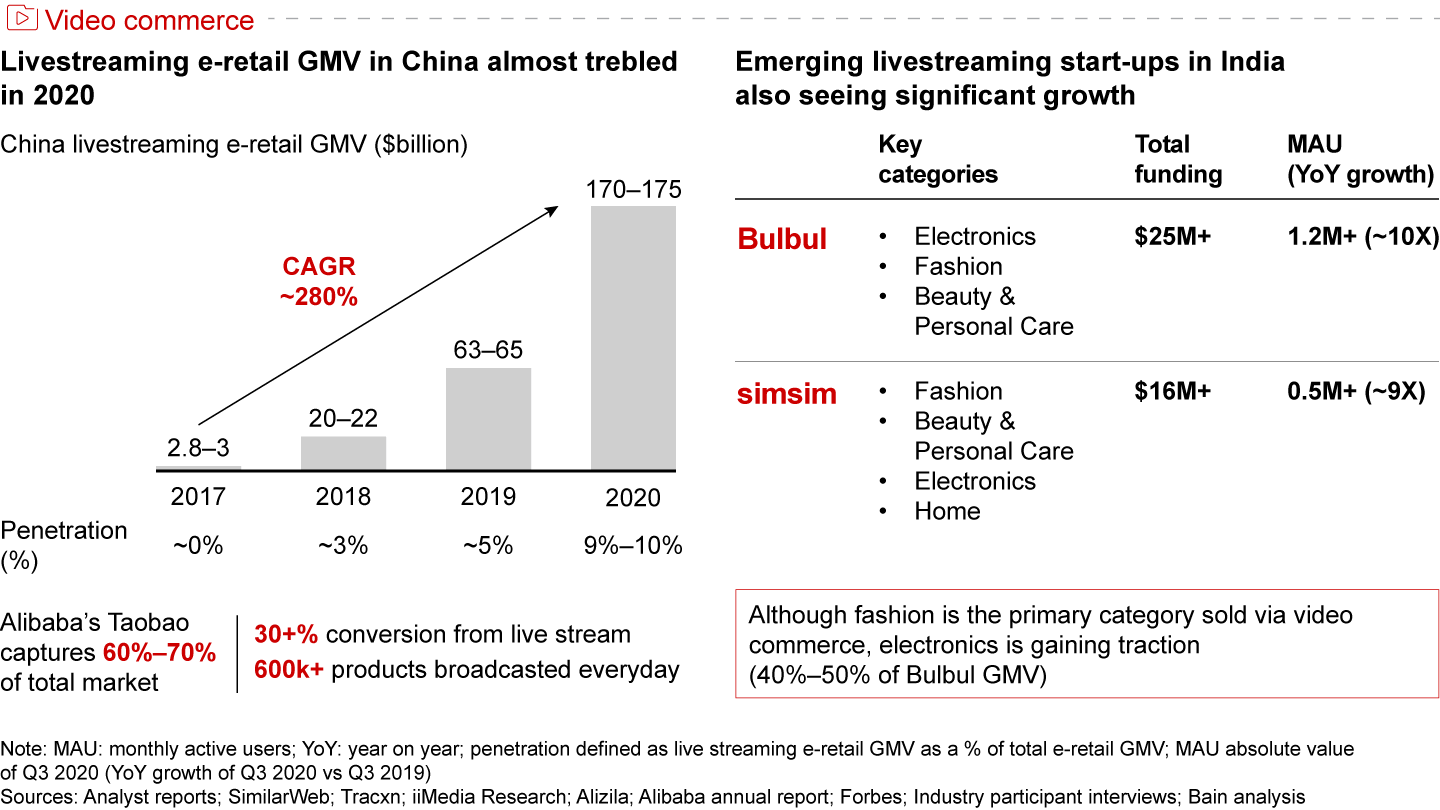 • Video commerce: Video content consumption has gained traction and has given birth to a substantial community of local creators and influencers. These creators are looking to monetise their following and are likely to drive an uptick in video commerce. Livestreaming commerce start-ups such as Bulbul and Simsim have seen 9–10x growth in user base over the last year. In China, livestreaming commerce already accounts for 9%–10% of GMV.