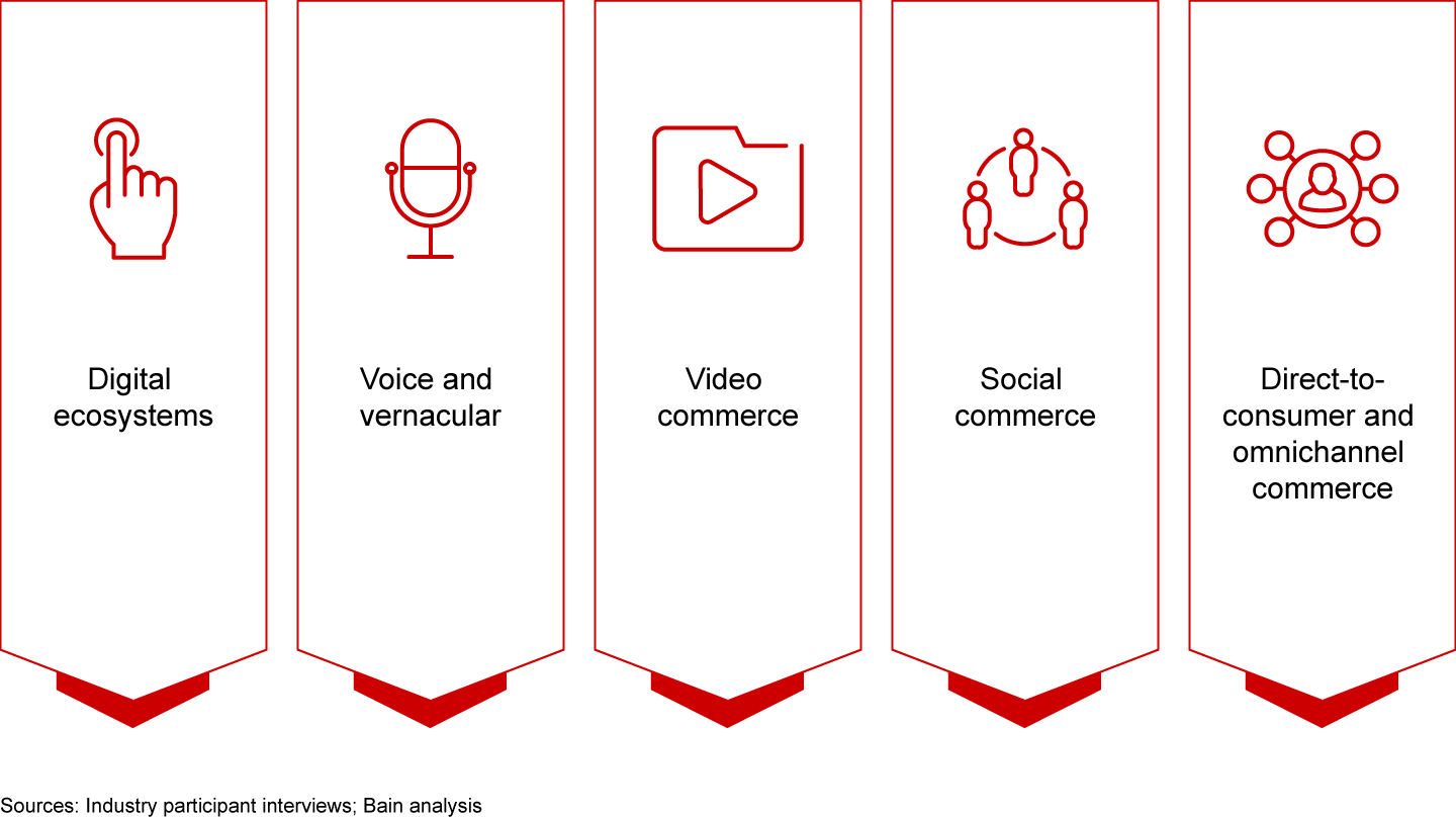 As e-retail accessibility continues to expand, a new wave of shoppers will come online. The majority of these future online shoppers are likely already in the digital funnel—watching videos and using chat and social media apps, but e-retailers will need to accelerate their transition to commerce. This involves a deep understanding of their needs and interaction patterns with brands and platforms. As firms look to out-innovate each other to win this next generation of online shoppers, we envision six mega-trends playing out in the India e-retail ecosystem: