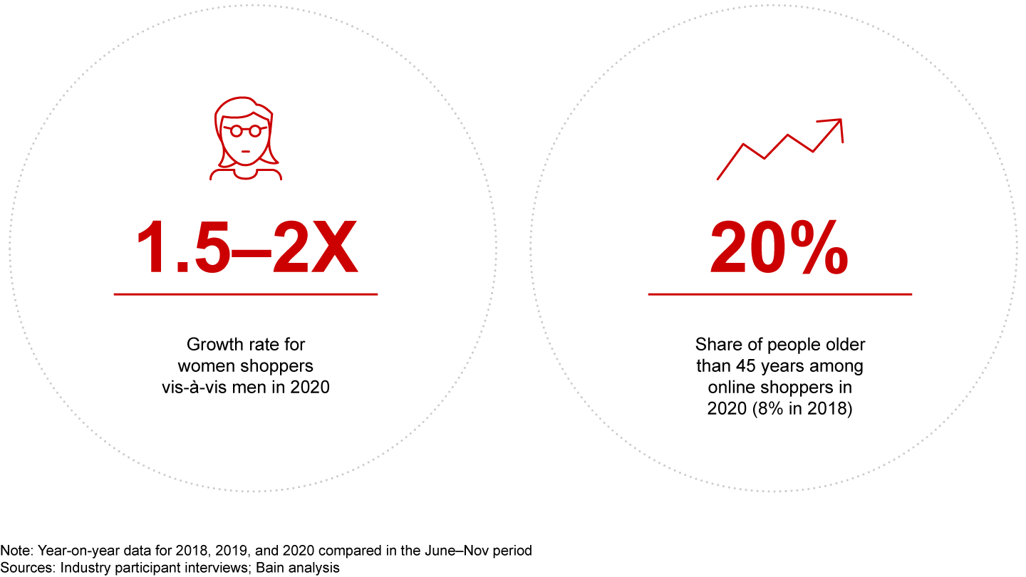 • The role of voice, vernacular, and social media in online shopping is expanding. Voice and vernacular are vital to attract the next generation of online shoppers—1 in 10 users have tried voice search, and 1 in 3 new users use a vernacular platform interface. Influencers and social media channels are also increasingly nudging consumers to shop online—in 2020, 40% of online shoppers made at least one purchase through social media channels (e.g., Facebook, Instagram, WhatsApp, etc.).