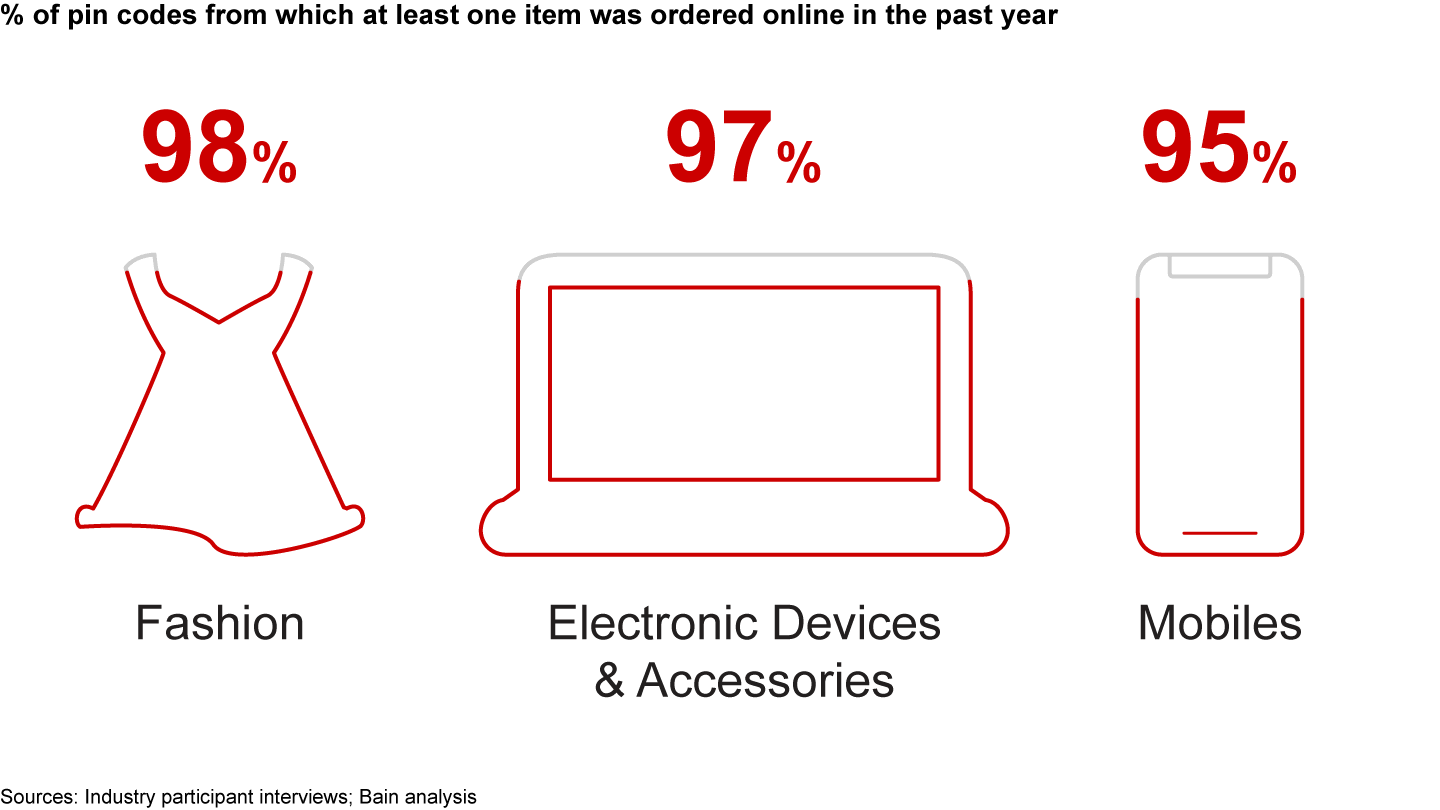 Digital payments are gaining fast, but cash remains key: Use of digital payments and credit has accelerated significantly, although cash purchases continue to account for approximately 45% to 50% of the e-retail gross merchandise value (GMV), even during the pandemic. The use of credit is more pronounced in the electronics category, with three times more adoption of equated monthly instalment (EMI) or credit schemes vs. other categories.