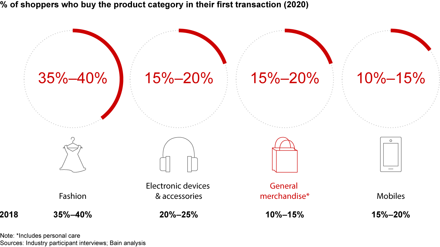 • Fashion, electronics, general merchandise, and mobiles continue to be key gateway categories for new online shoppers. Whereas fashion continues to lead as a first purchase (35%–40% new shoppers bought fashion in their first transaction in 2020), general merchandise increasingly attracts first-time online shoppers (15%–20% of shoppers bought general merchandise in their first transaction in 2020 vs. 10%–15% in 2018).