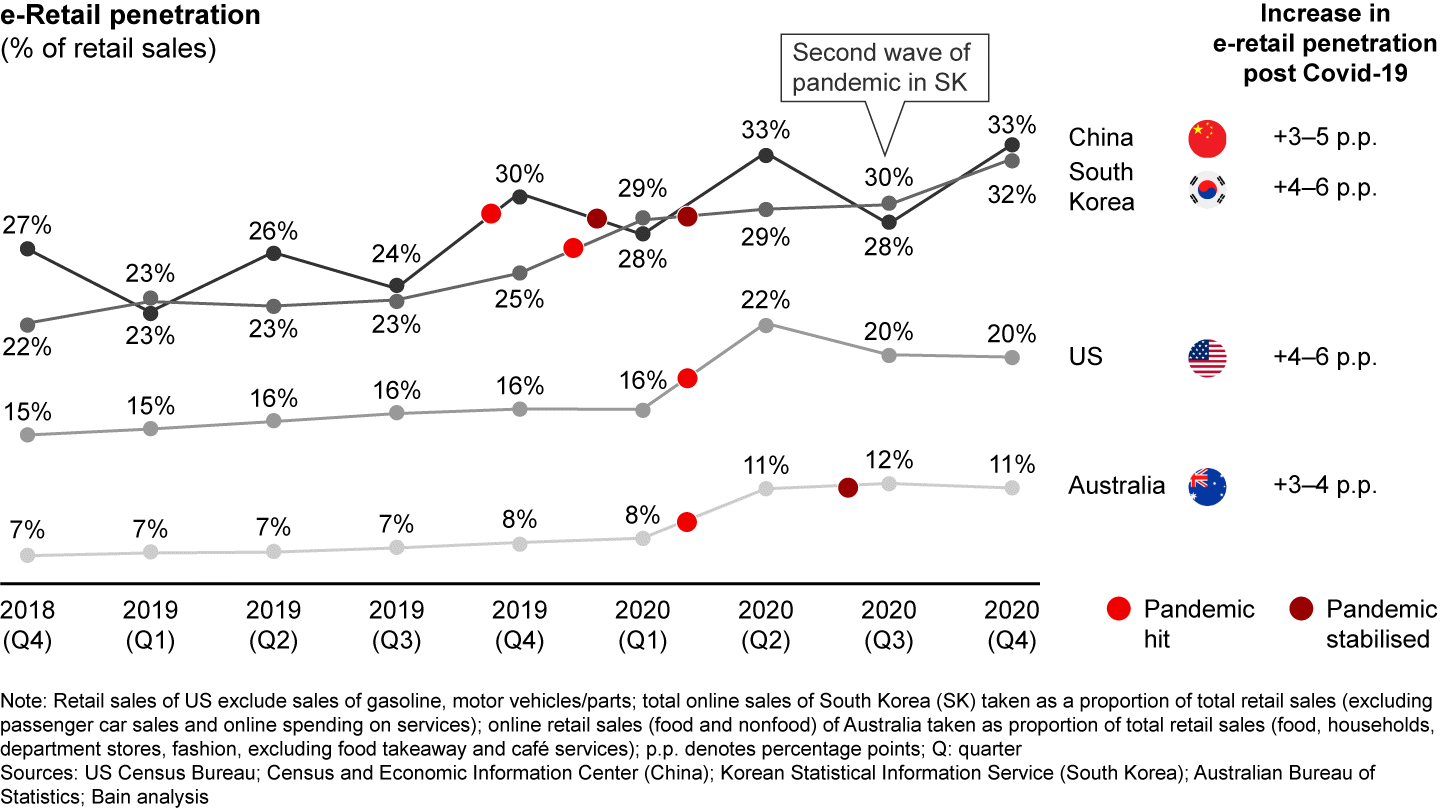 This Covid-19–induced inflection in e-retail is a global phenomenon driven by an enhanced consumer need for safety and convenience especially during elongated stay-at-home periods. This has also played out in India wherein e-retailers have been the lifeline for both consumers and sellers—enabling access to essential commodities and hygiene products to millions of households during the lockdown, and providing business avenues to thousands of sellers. We expect the surge in penetration to sustain post stabilisation, as a similar trend has been seen globally.