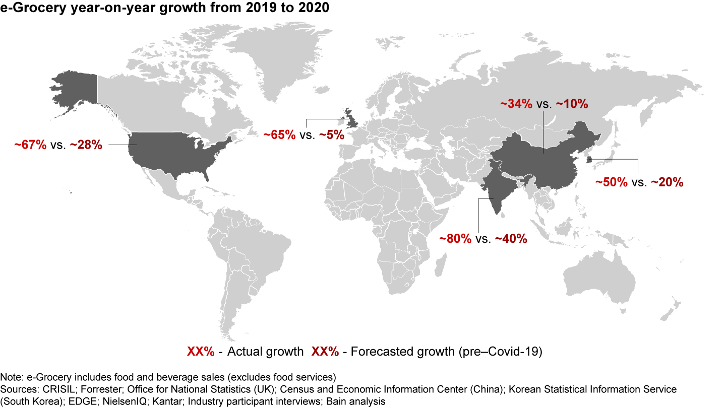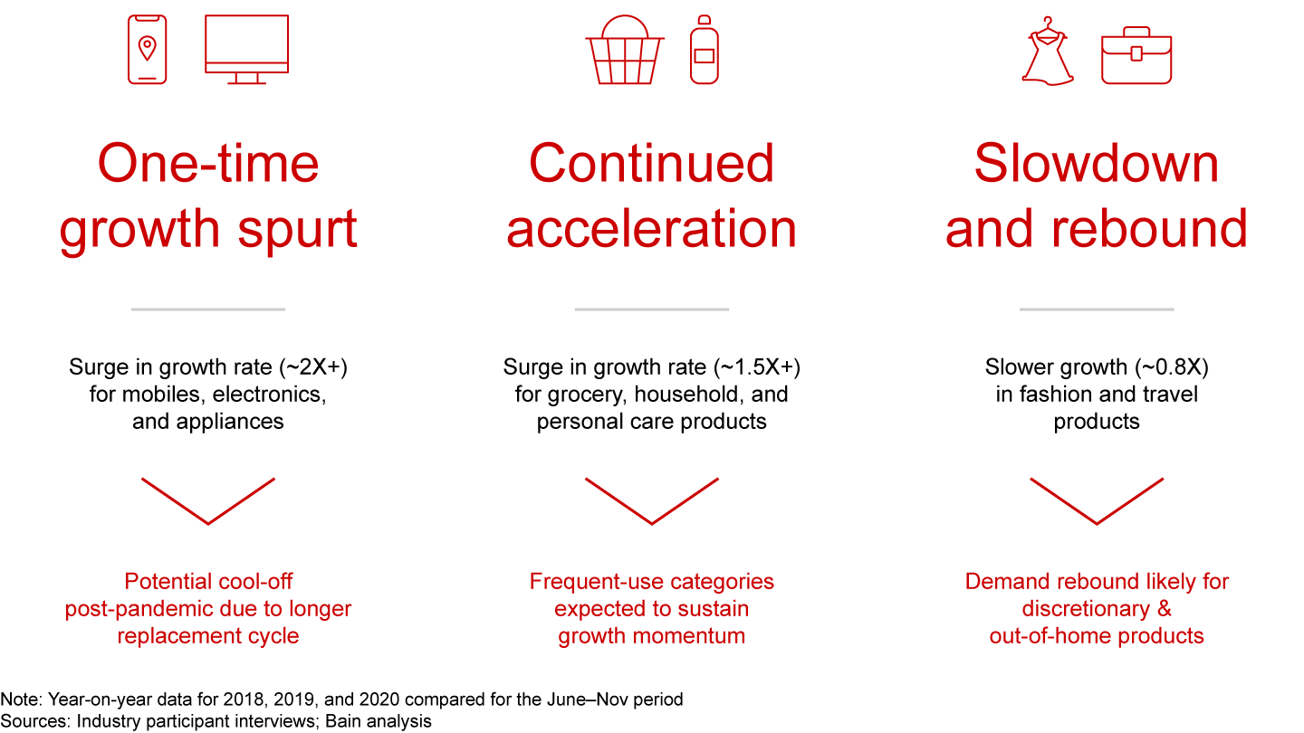 • E-retail categories have seen disparate growth and recovery patterns through the past 12–18 months of the pandemic: The mobiles and electronics categories witnessed a one-time growth spurt; frequent-use categories such as grocery, household, and personal care saw continued acceleration; and discretionary categories such as fashion and travel products saw relatively slower growth but have started rebounding in 2021.