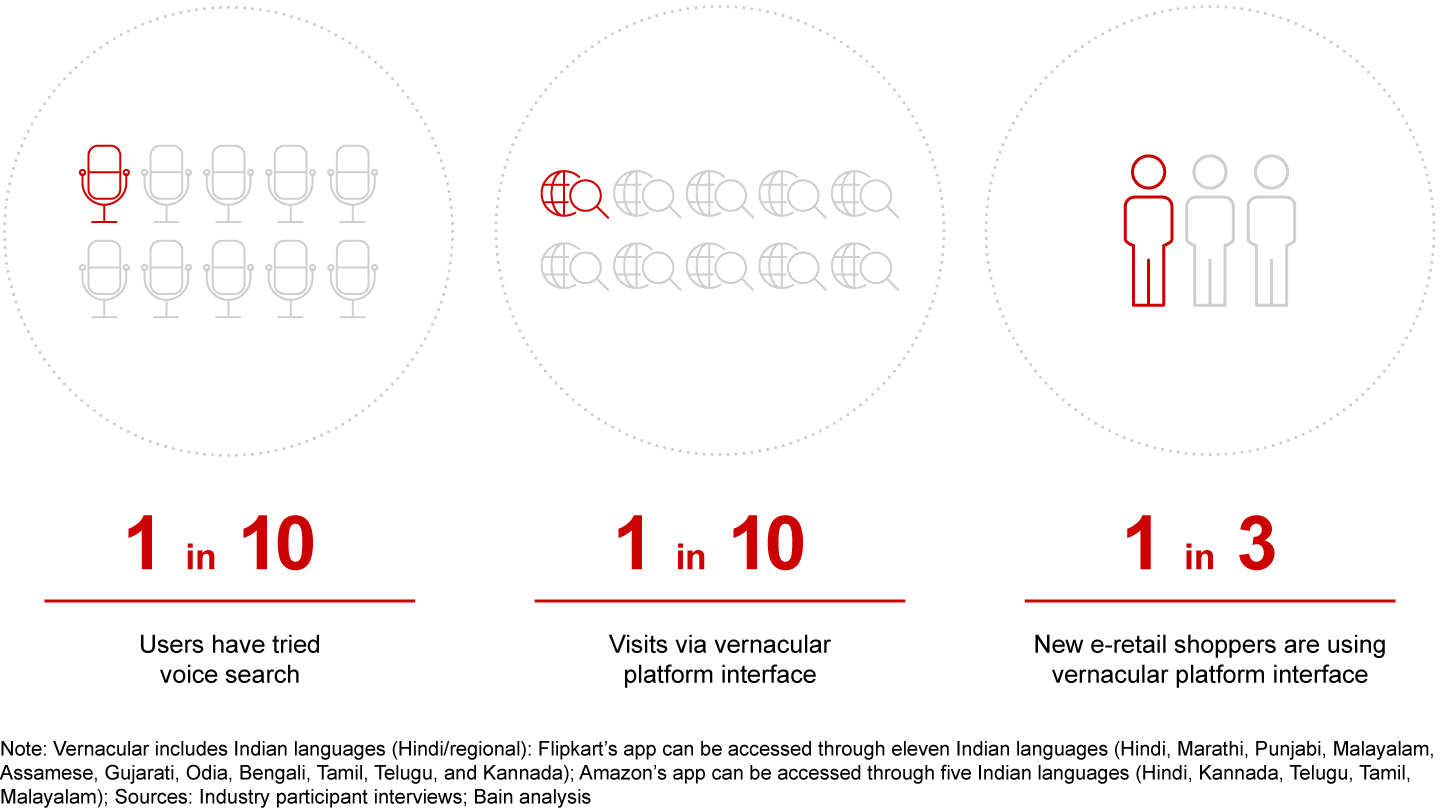 Voice and vernacular are no longer niche: 1 in 10 platform users adopt voice search, and 1 in 3 new e-retail users visit through a vernacular platform interface. Voice and vernacular searches will increasingly become mainstream.