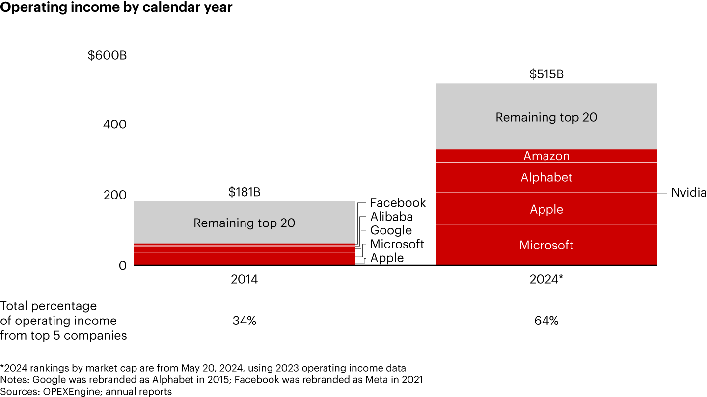What’s more, value is increasingly concentrated in these sector leaders. Together, the top five tech companies account for 63% of the market capitalization of the top 20 companies in the sector, up from only 53% a decade ago (see Figure 2). The top five also represent 64% of the profit pool, nearly twice the amount it was 10 years ago (34%).
