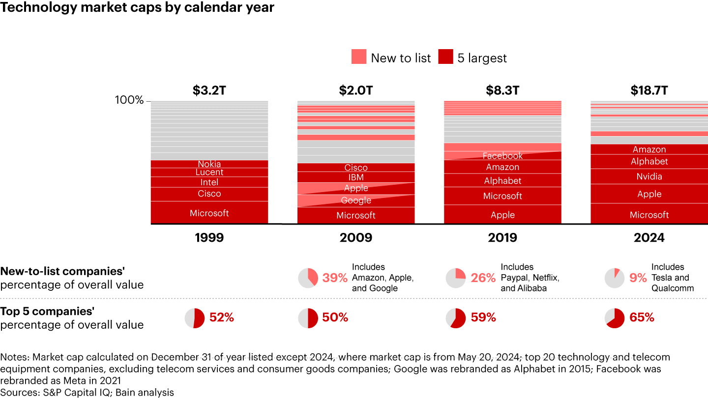 Disruption in the technology sector hasn’t slowed down, but turnover among the top companies has: Four of the top five most valuable technology companies in 2024 were among the top tech companies in 2019, and three of the five were on the list in 2009—Microsoft, Apple, and Alphabet, which was then Google (see Figure 1).
