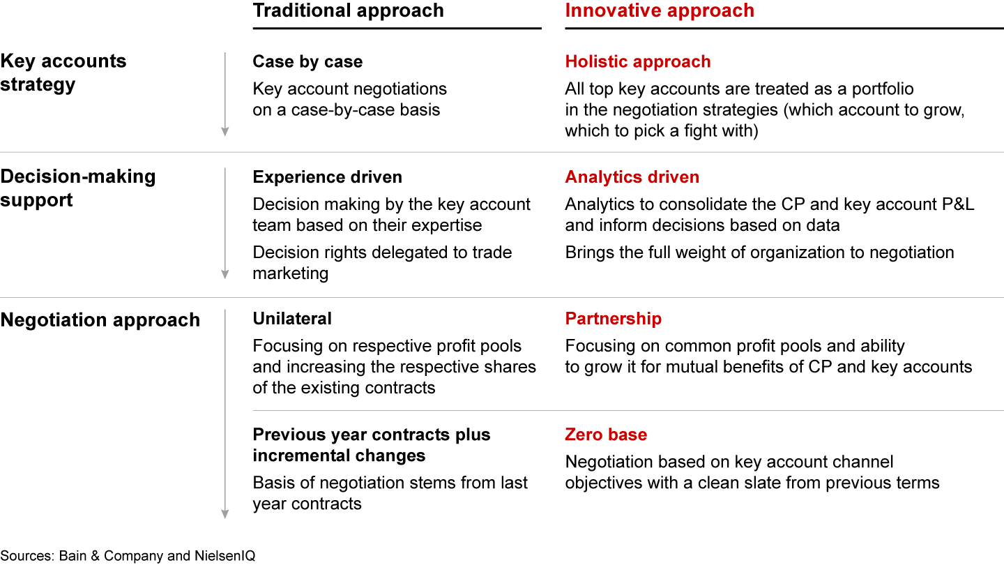 Holistic approach: The traditional approach is case by case, looking at each client one by one, and is mainly driven by past experiences. It's therefore often delegated to the key account managers and trade marketing managers. In this new normal, consider taking a holistic approach to the channel: What are the different customers that you have in the modern trade channel? What is the total profit investment you want to have across all the different customers within that channel?
