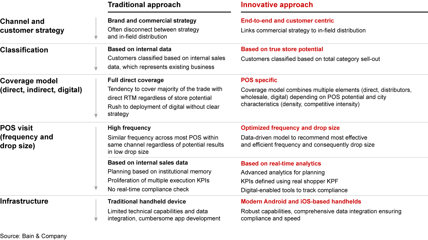 Route to market: Define and set up a route-to-market strategy given the changes in the channel to drive profitable growth. Fixing gaps, the lack of availability, and in-store execution are big drivers of lost sales.