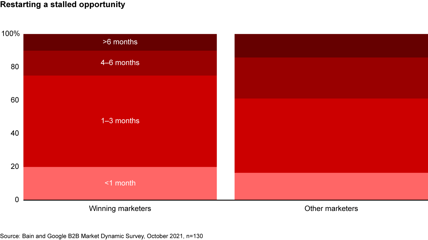 Coming out of pipeline reviews, winners are more likely to take actions focused on customers and prospects, rather than on internal activities (see Figure 2). Winners are also more likely to engage customers and prospects in new ways, such as with new content. Other marketers, by contrast, are more likely to focus on activities such as reallocating coverage or reprioritizing accounts.