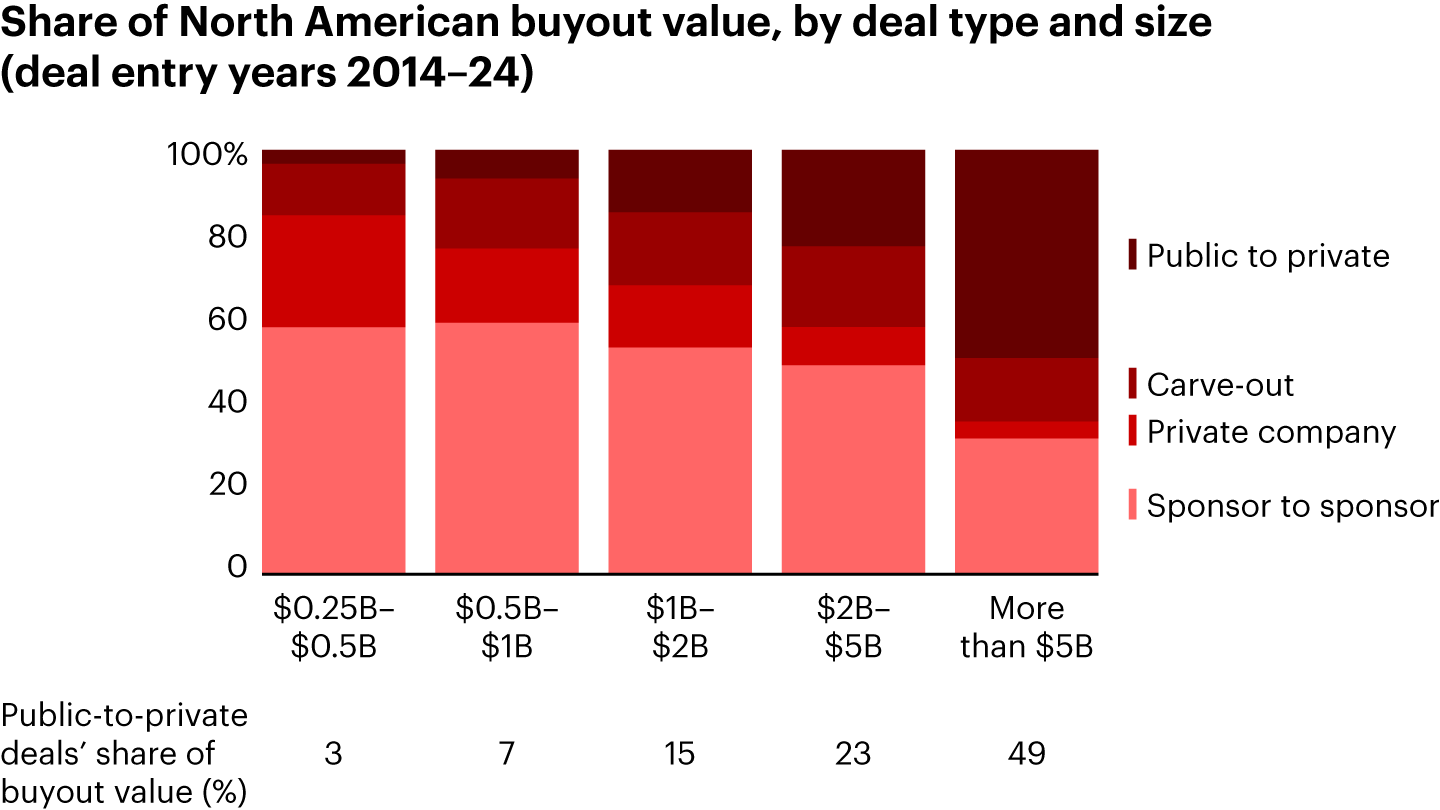Sources: Dealogic; Bain analysisPublic-to-private (P2P) deals, like the $8.4 billion buyout of Smartsheet by Vista Equity Partners and Blackstone, continued to dominate the high end of the market. P2P deals increased to close to $250 billion globally in 2024 and represented almost 50% of deals valued at $5 billion or more in North America (see Figure 7). This level of take-private activity might seem counterintuitive given the run-up in the US public equity markets. But specialists are clearly finding opportunities to take advantage of mispriced assets in the US, and European public markets have been much less robust.