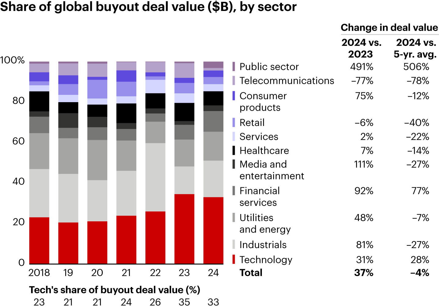 Sources: SPS by With Intelligence; Bain analysisThe technology sector remained private equity’s staple, representing 33% of buyout deals by value and 26% by volume (see Figure 8). Activity also percolated at the intersection of tech and healthcare, including KKR’s acquisition of a 50% stake in healthcare analytics company Cotiviti from Veritas Capital, which valued the company at around $10 billion. Among other sectors, financial services deal value grew 92% year over year and industrials 81%, both bouncing back after a particularly challenging 2023. Insurance deals such as Sixth Street’s $5 billion P2P deal for Enstar stood out.