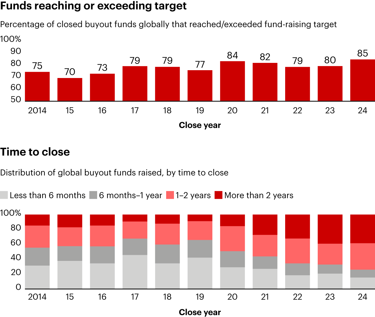 Appunti: Percentage of funds that reached/exceeded target based on share of count; distribution of global buyout funds raised by time to close includes only those funds for which date of launch is available; includes all buyout funds that closed in the respective year for which both the fund-raising target and the value of final funds raised is known; buyout category includes buyout, balanced, coinvestment, and coinvestment multimanager fund types; excludes SoftBank Vision Fund