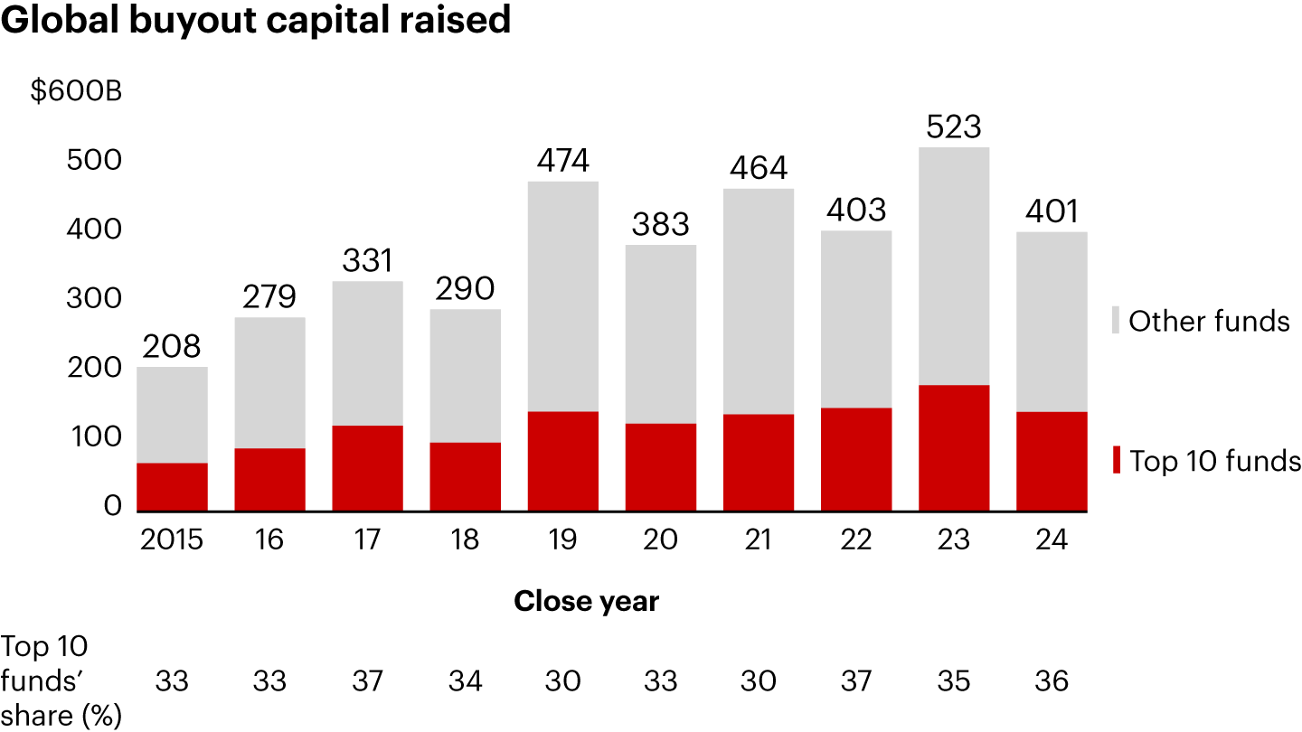Appunti: Top 10 funds defined as the largest 10 funds raised by value in a single year, independent of other years’ fund-raising levels; includes closed-end and commingled funds only; buyout category includes buyout, balanced, coinvestment, and coinvestment multimanager fund types; includes only those funds with final close data; excludes SoftBank Vision Fund