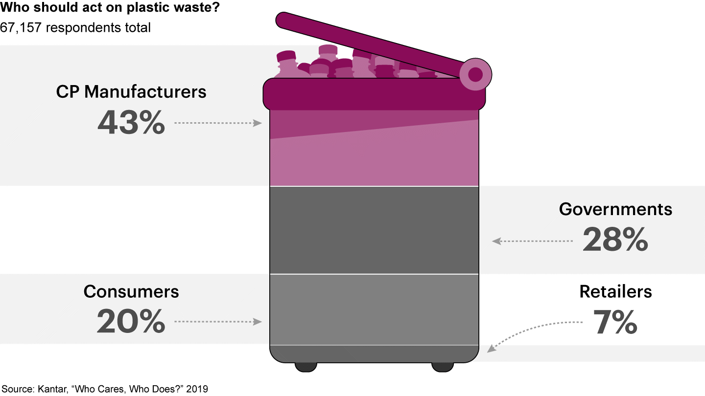 Such moves resonate with consumers. In Europe, 52% have already switched brands or products based on packaging, and an equal percentage in the UK favor taxing all plastic packaging of food products. Roughly 38% of Americans say they would be more likely to buy produce from plastic-free supermarkets. And 43% say consumer products companies should bear the responsibility of acting on plastic waste—only 28% feel it is the responsibility of government (see Figure 2).